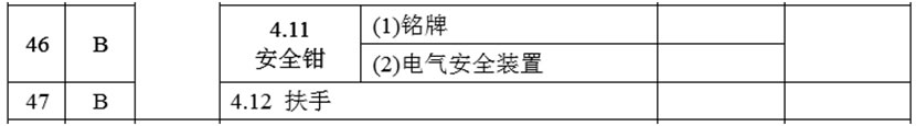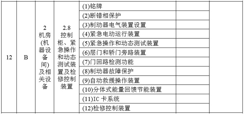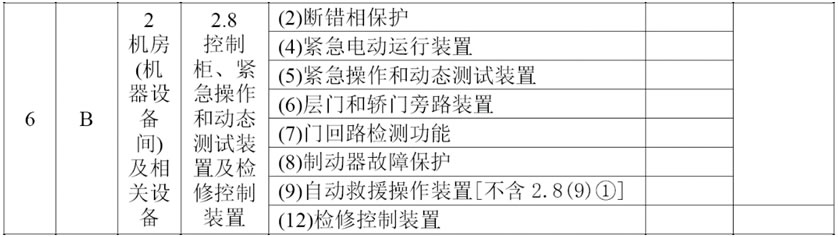 (4)將2.8項的項目及類別調(diào)整為“控制柜、緊急操作和動態(tài)測試裝置及檢修控制裝置B”,在檢驗內(nèi)容與要求中增加: