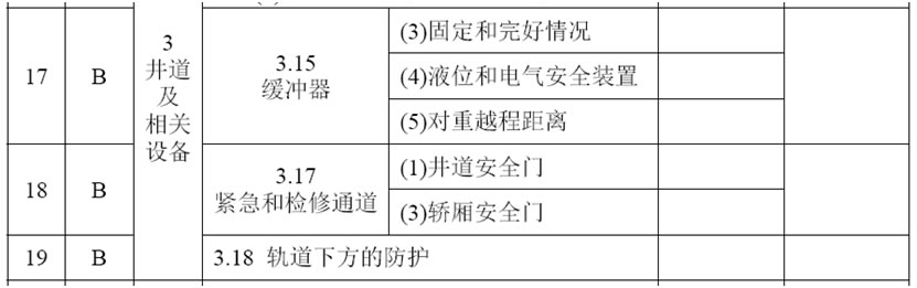 (17)增加3.18項,項目及類別為:“軌道下方的防護 B”,檢驗內(nèi)容與要求為:“如果人員可以進入電梯運行軌道的下方,應(yīng)當(dāng)設(shè)置無孔的防護隔障,以擋住和收納可能從斜行電梯上掉落的碎片或者零件”;