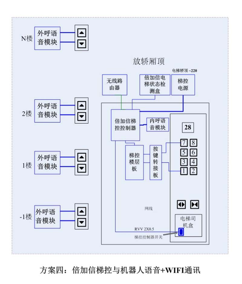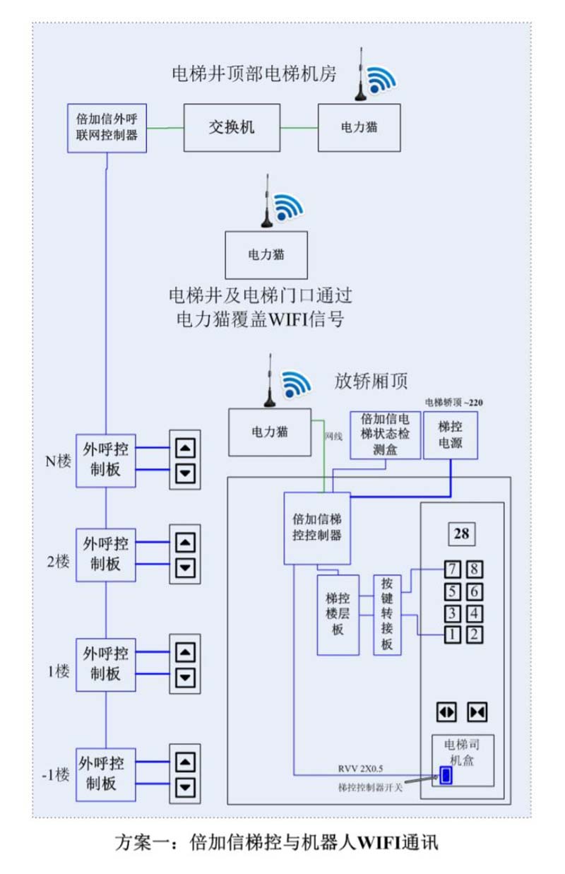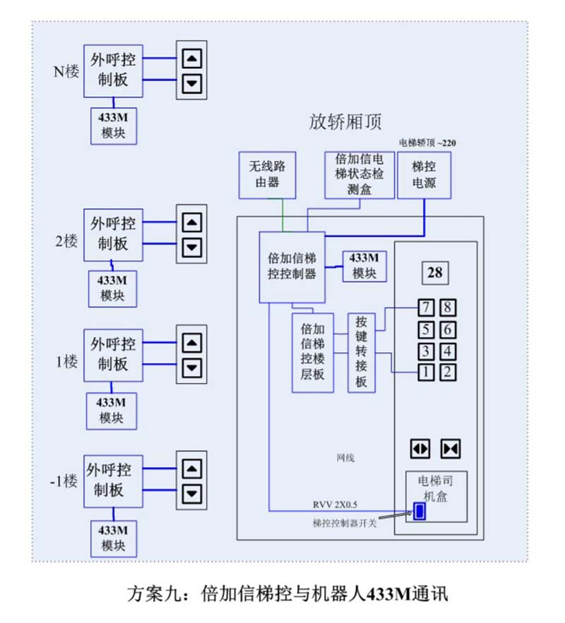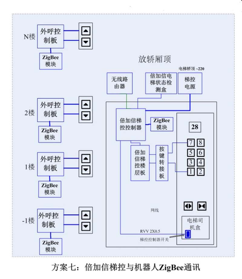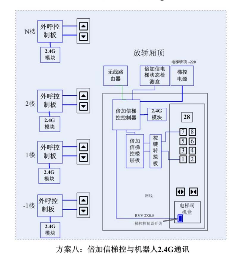 (1)機器人在電梯外,通個Wifi、藍牙、LoRa、Zigbee、2.4G、433M、語音或4G網(wǎng)絡等發(fā)送指令倍加信梯控系統(tǒng),系統(tǒng)自動點亮上樓或下樓按鍵,實現(xiàn)呼梯功能。