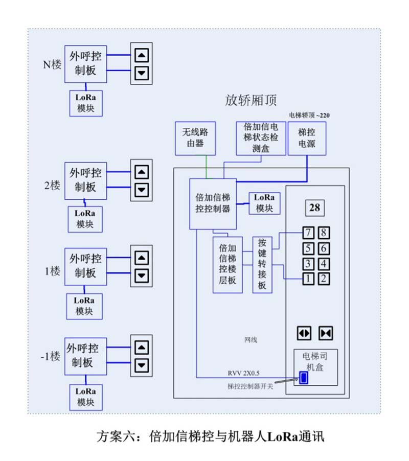 (1)機(jī)器人進(jìn)入電梯后,通個(gè)Wifi或4G網(wǎng)絡(luò)發(fā)送指令給倍加信梯控云平臺(tái),倍加信梯控云平臺(tái)收到指令后,將指令發(fā)給倍加信梯控系統(tǒng),倍加信梯控系統(tǒng)自動(dòng)點(diǎn)亮對(duì)應(yīng)樓層按鍵,比如發(fā)去6樓指令,則6樓按鍵自動(dòng)點(diǎn)亮,電梯送機(jī)器人員到6樓。