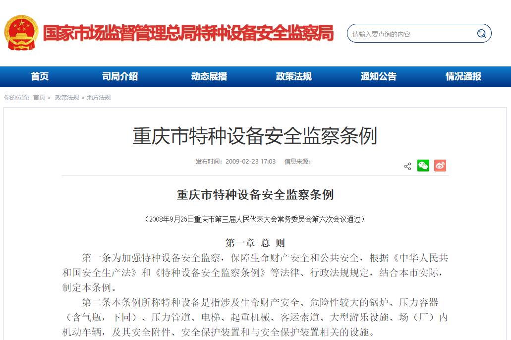 《重慶市特種設備安全監察條例》2008年9月26日重慶市第三屆人民代表大會常務委員會第六次會議通過