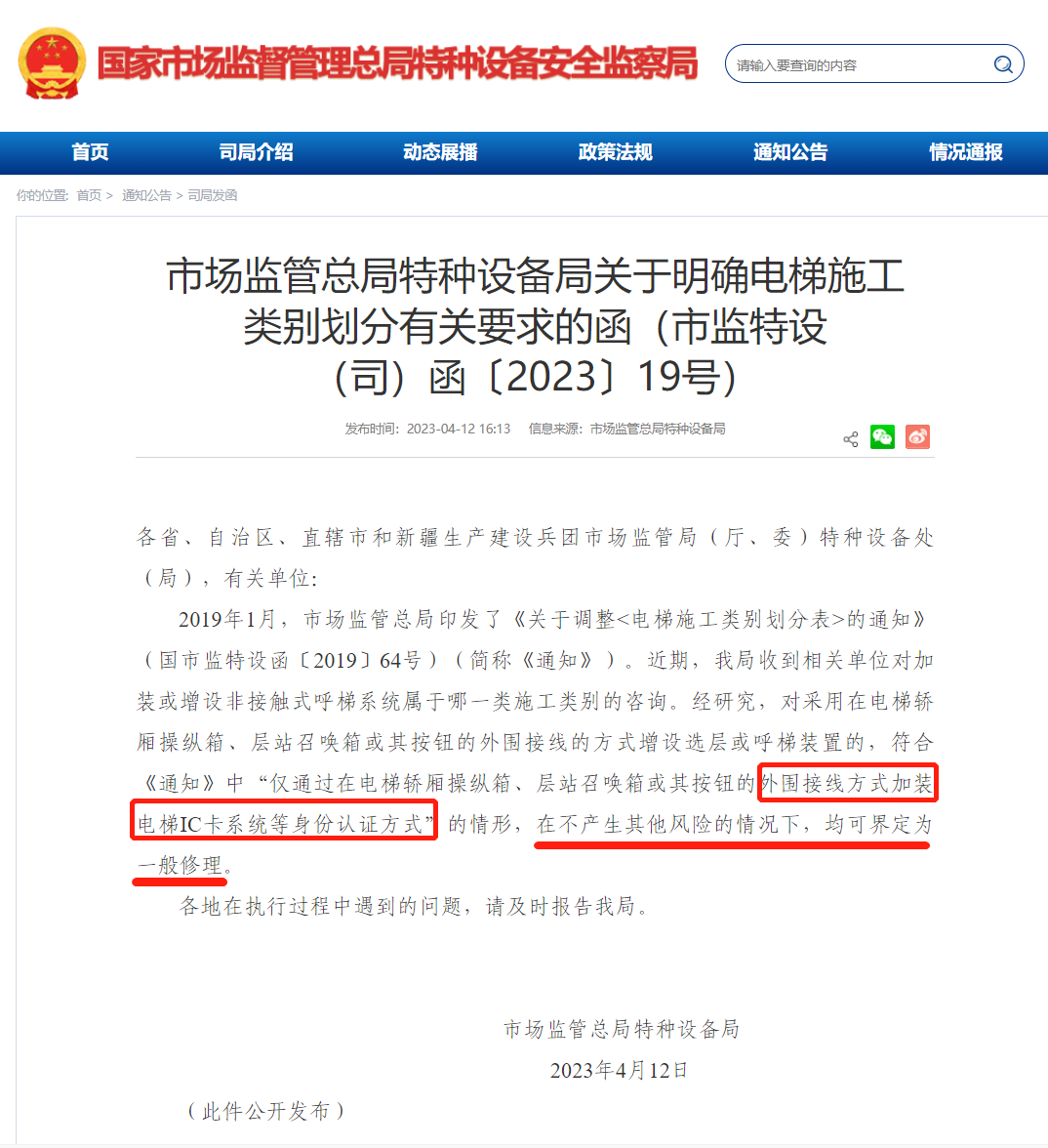 市場監(jiān)管總局特種設備局關于明確電梯施工類別劃分有關要求的函(市監(jiān)特設(司)函〔2023〕19號)